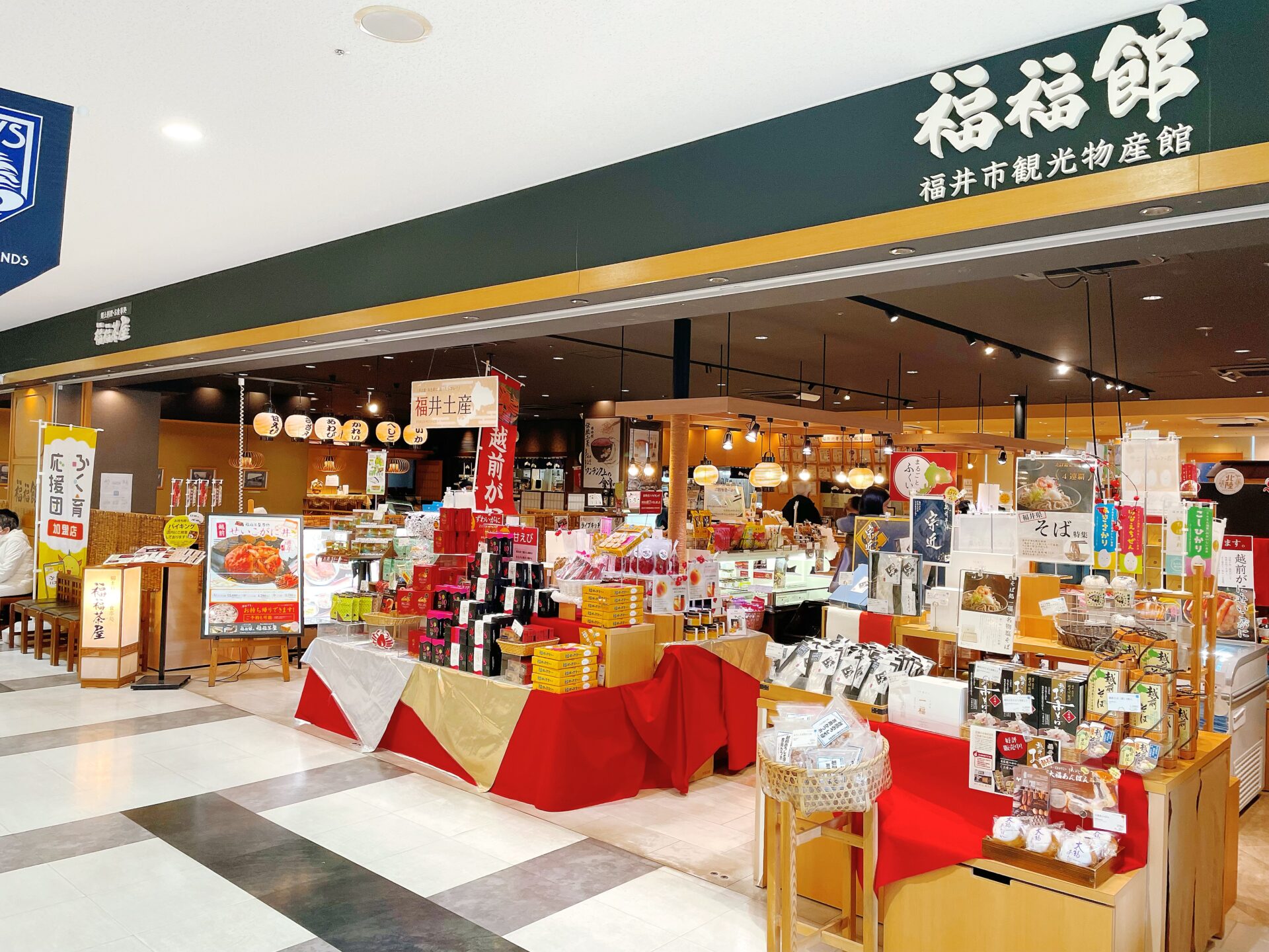 🌸2階 福々館・福々恐竜おみやげ売場・福々茶屋 ハピリン2階福人喜の隣にある総合的なお店です。おみやげの品揃えが豊富で、お昼食のバイキングも大人気です。